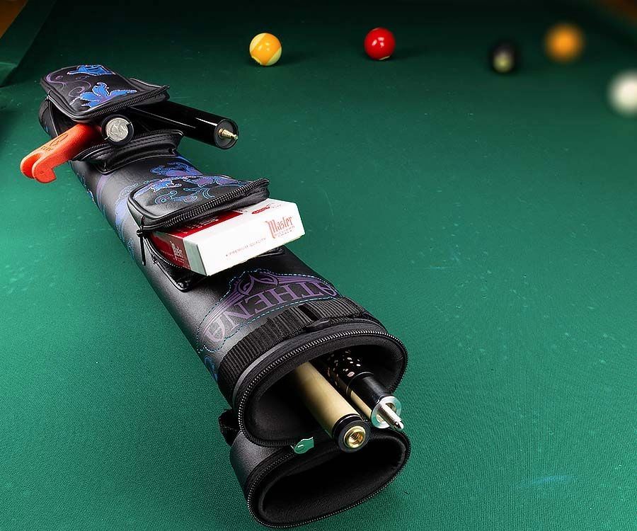 If butterflies are your favorite then you will love this 2 butt and 2 shaft hard case. Â This vinyl case is black with bright purple and blue butterflies featuring the new Athena owl logo. This case includes an upper handle and an adjustable shoulder strap.