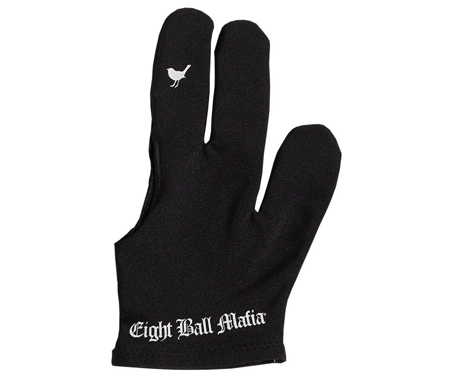 The Eight Ball Mafia black glove with “little birdy” design on the middle finger to tell opponents how you really feel. This glove is available for left bridge hand only.