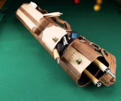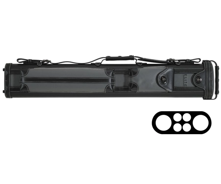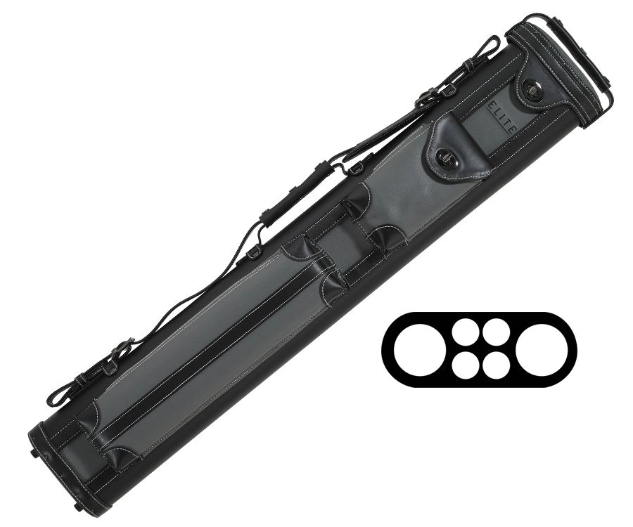 Elite 2 butts & 4 shafts vintage cue case in grey with carrying handle on top and side and adjustable shoulder strap.